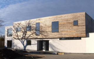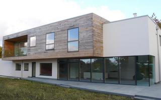 Steel frame on deep strip foundations with insulated STO render cladding, alternating with sweet chestnut cladding on the 1st floor.