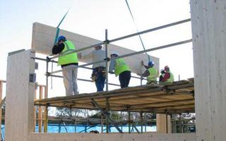 The building was constructed using large sections of 'Glulam' structural timber as beams, columns, walls and balustrades- forming the basic structural frame. The enclosing walls and floors were made using newspaper insulated 'Masonite' walls, with a wonderfully patterned 'Trespa' rain screen externally