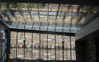 Infilling between the party wall and existing 2 storey extension to a period terraced house in North London with a structurally glazed conservatory..