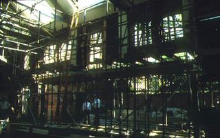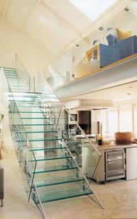 The laminated glass risers in the stairs act compositely as part of a 'stringer truss' to span from floor to floor supporting the glass treads and balustrade, thus allowing the steel elements to be minimal.
