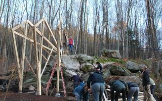 Using local sourced materials that could easily be obtained (standard cut timber sizes from 100x50 to 300x50 max and off-the-shelf fixings from the local builders merchant in Vermont) was key to construction which took place over a few cold winter days on a tight budget.