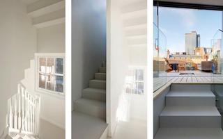 A lot of the structural work on the house was remedial, as it had been neglected for generations, but a carefully designed modernist pavilion was added on to the roof to access the spectacular views across London. The overall building height (set by the tightly negotiated Planning Permission) meant that the roof structure of the pavilion was designed using very slim steel beams. Carefully considered details were developed in close collaboration with the Architects to achieve the sharp angled eaves, and deceptively simple stairs with glass balustrading.