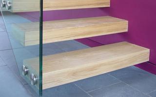 Internal stairs constructed on steel bars cantilevered from a steel stringer, treads clad in timber and connected with structural glass balustrade.