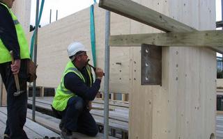 The building was constructed using large sections of 'Glulam' structural timber as beams, columns, walls and balustrades- forming the basic structural frame. The enclosing walls and floors were made using newspaper insulated 'Masonite' walls, with a wonderfully patterned 'Trespa' rain screen externally