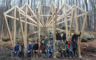 Using local sourced materials that could easily be obtained (standard cut timber sizes from 100x50 to 300x50 max and off-the-shelf fixings from the local builders merchant in Vermont) was key to construction which took place over a few cold winter days on a tight budget.